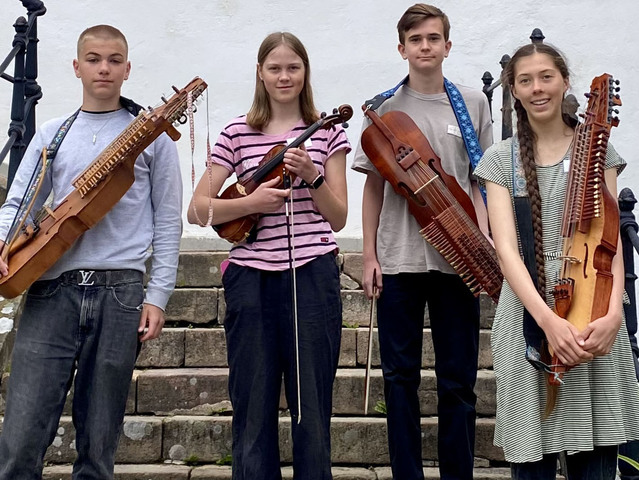 Här står 2025 års Eric Sahlström-stipendiater på trappan till Ekebyholms slott där de träffades på låtkursen sommaren 2025. Från vänster: Johan Bondensson, Falun, Linnea Nilsson, Tobo, Eddy Isaksson, Söderhamn och Miyako Inoye, Florida USA.