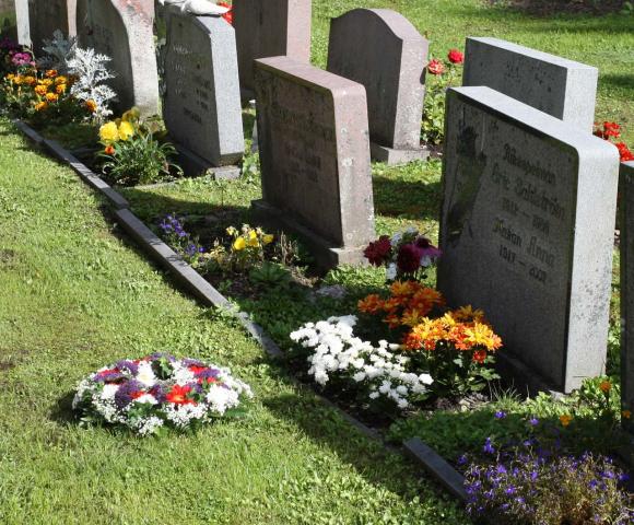 Marianne Möllerman läser minnesord. Karl-Gunnar Marklund lägger en blomsterkrans på Erics grav. Foto: Esbjörn Hogmark.