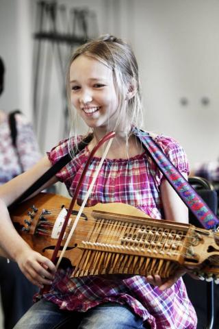 I sal K4 hade Eric Sahlström Institutet anordnat en workshop där man fick prova att spela nyckelharpa. Instrument fanns att låna. Foto: Karin Kronvall