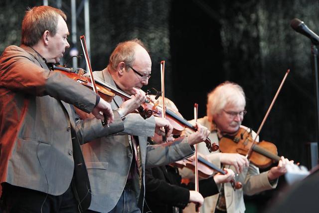 Grand final på galan. Magnus Holmström ledde ett 20-tal unga nyckelharpister i Vagnshusschottis tillsammans med övriga medverkande. Riktigt tunggung! Foto: Elise Peters